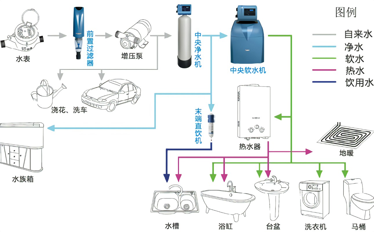 通过过滤、吸附、离子交换等方式,提供更健康的饮用水,以及能延长五金卫浴等设备使用寿命,使衣服柔软清洁,皮肤光泽细腻的软水。